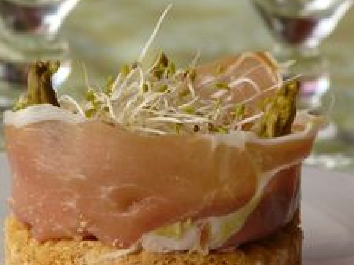 Charlottes aux asperges, jambon cru et tomme de brebis votez maintenant Entréefacile25 min367 Kcal Envoyer cette recette à un ami Imprimer cette page Poser une question à l'auteur Publier votre photo de cette recette Ingrédients 3 1 jaune d’oeuf 50 g de beurre 60 g de farine 1/2 sachet de levure 20 g de fromage de brebis râpé 100 g d'asperges en boîte 9 asperges fraîches, fines si possibles 1,5 feuille de gélatine 130 g de fromage blanc graines d'alfalfa 3 tranches de jambon cru