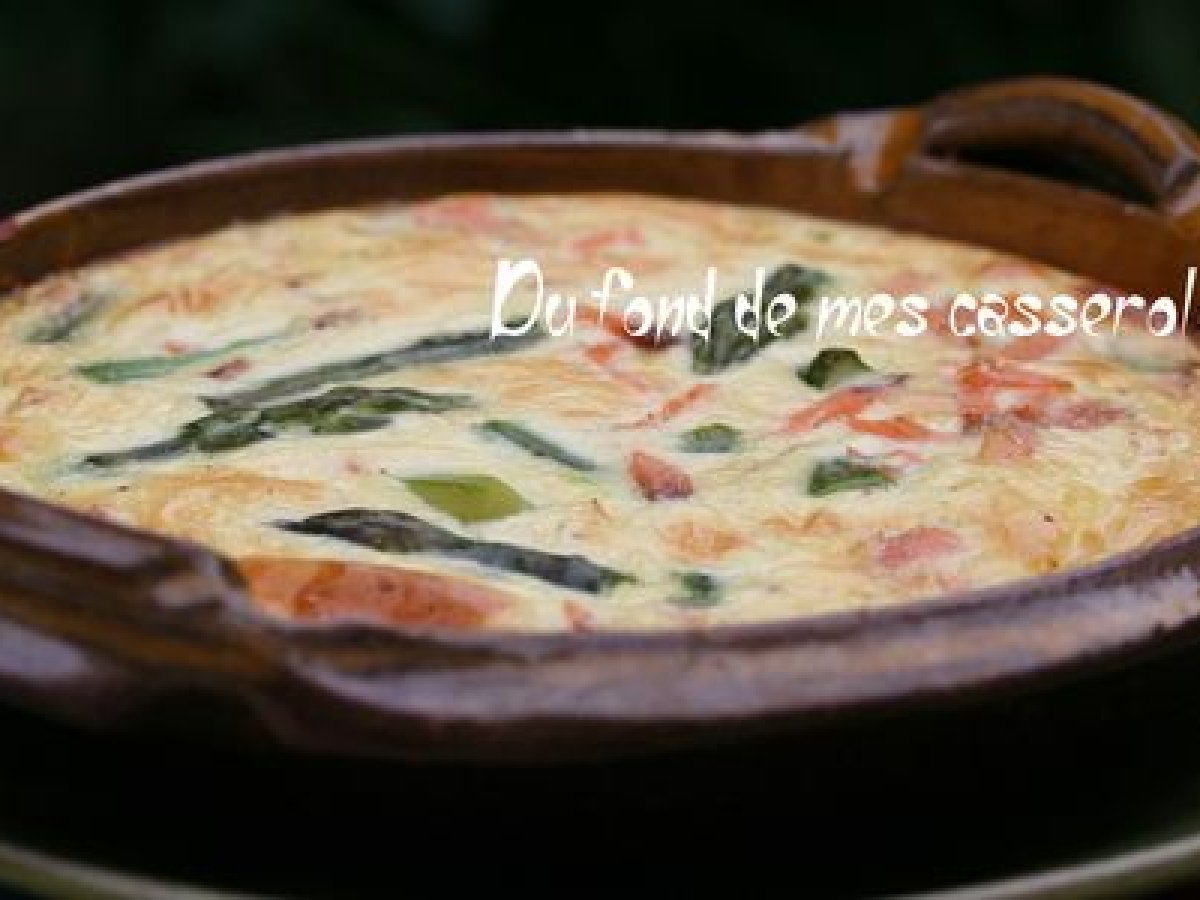 Clafoutis d'asperges vertes au saumon fumé Entréefacile1 h 5 m278 Kcal Envoyer cette recette à un ami Imprimer cette page Poser une question à l'auteur Publier votre photo de cette recette Ingrédients 4 1 botte d'asperges vertes 1 oignon 2 tranches de saumon fumé 2 oeufs 20 cl de crème liquide 20 cl de lait Sel, poivre
