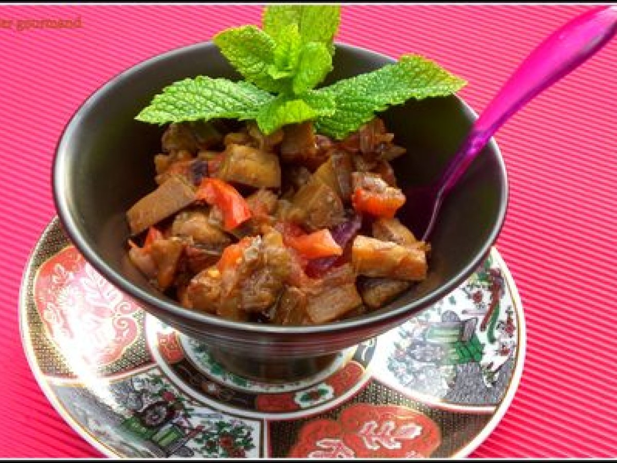 Confit aigre-doux aux aubergines et tomates de jardin à la menthe poivrée