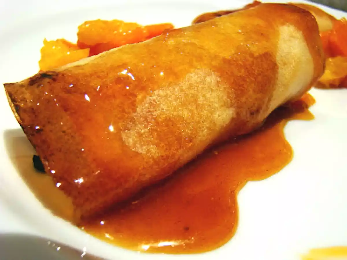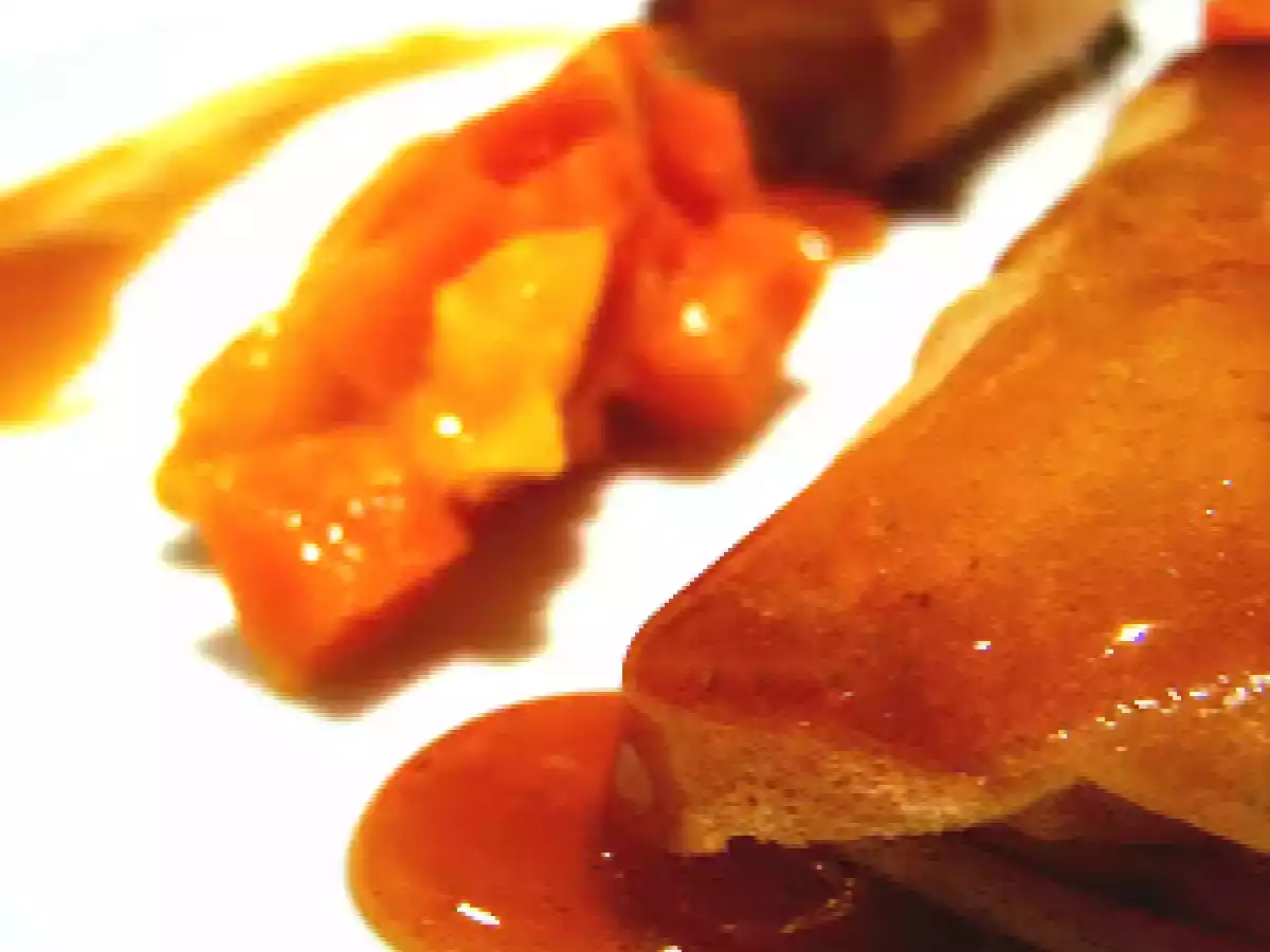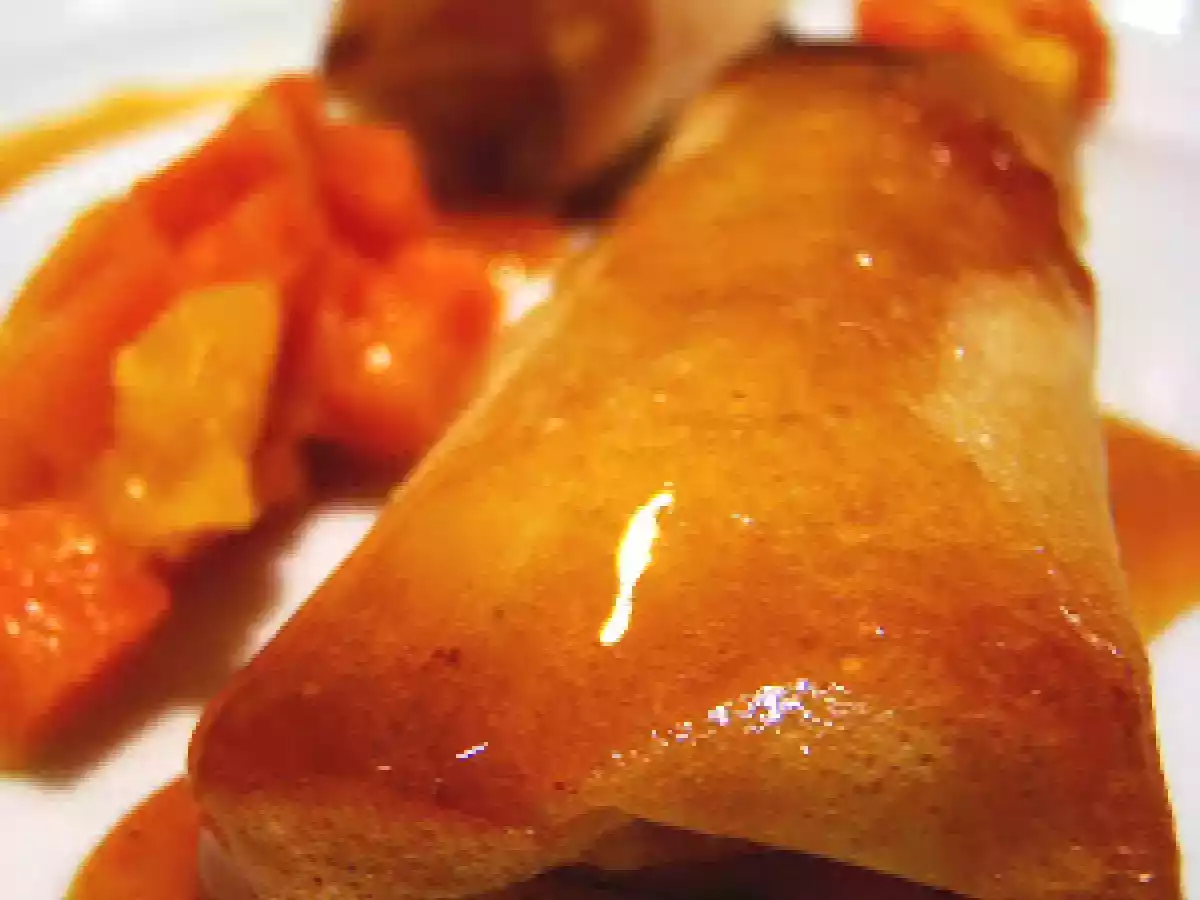 Croustillant carottes-abricots et caramel d'epices votez maintenant PrécédentSuivant Entréefacile25 min Envoyer cette recette à un ami Imprimer cette page Poser une question à l'auteur Publier votre photo de cette recette Ingrédients 4 Croustillants de carottes et abricots 1,5 dl de jus d'orange feuilles de brick 8 abricots secs 400 g de carottes taillées en des ½ oignon 2 cuillères a soupe de sucre glace, 1 noix de beurre fondu huile d'olive sel et poivre Le caramel : le jus d'une orange 1 pointe de curry 1 pointe de gingembre frais râpé quelques graines de cardamome 1 trait de vinaigre balsamique blanc 80 g de sucre