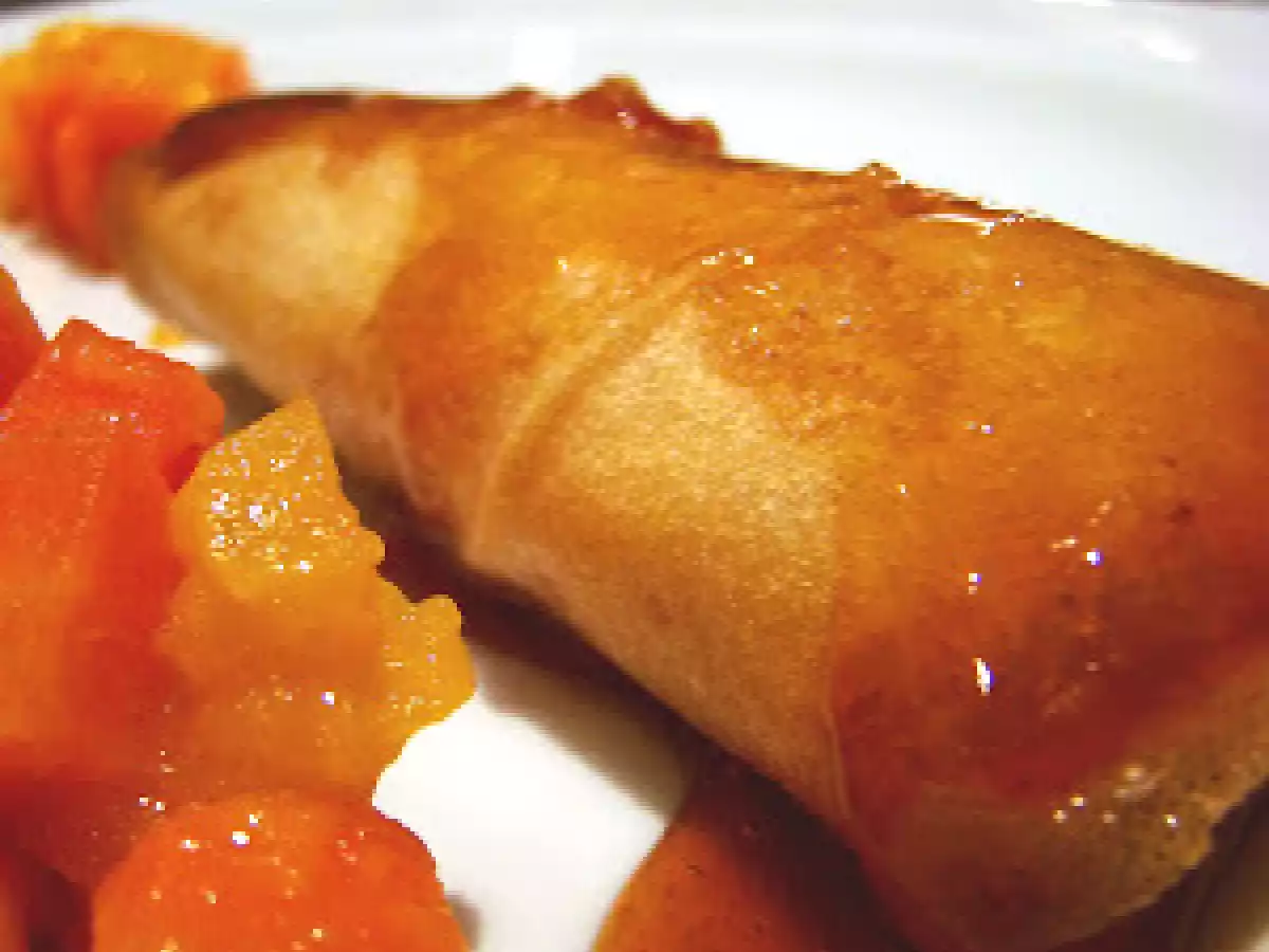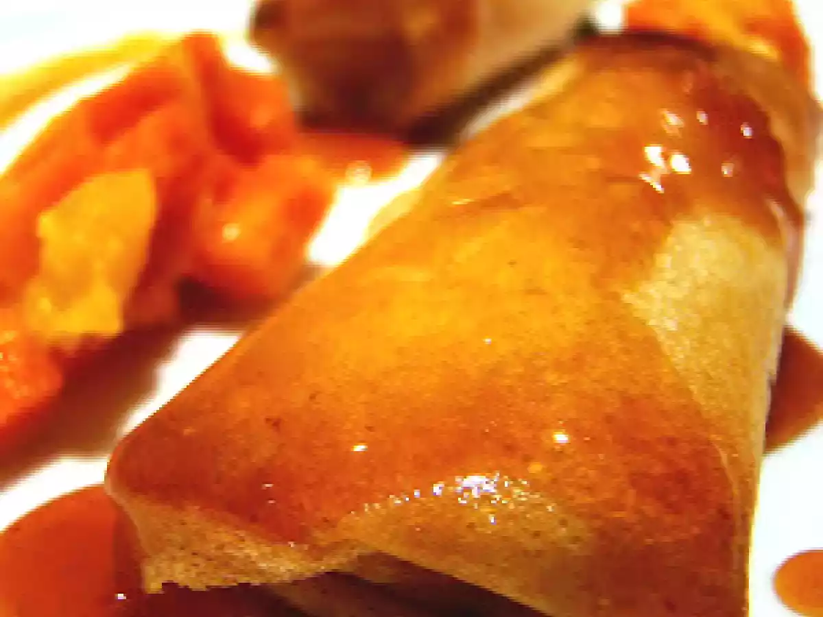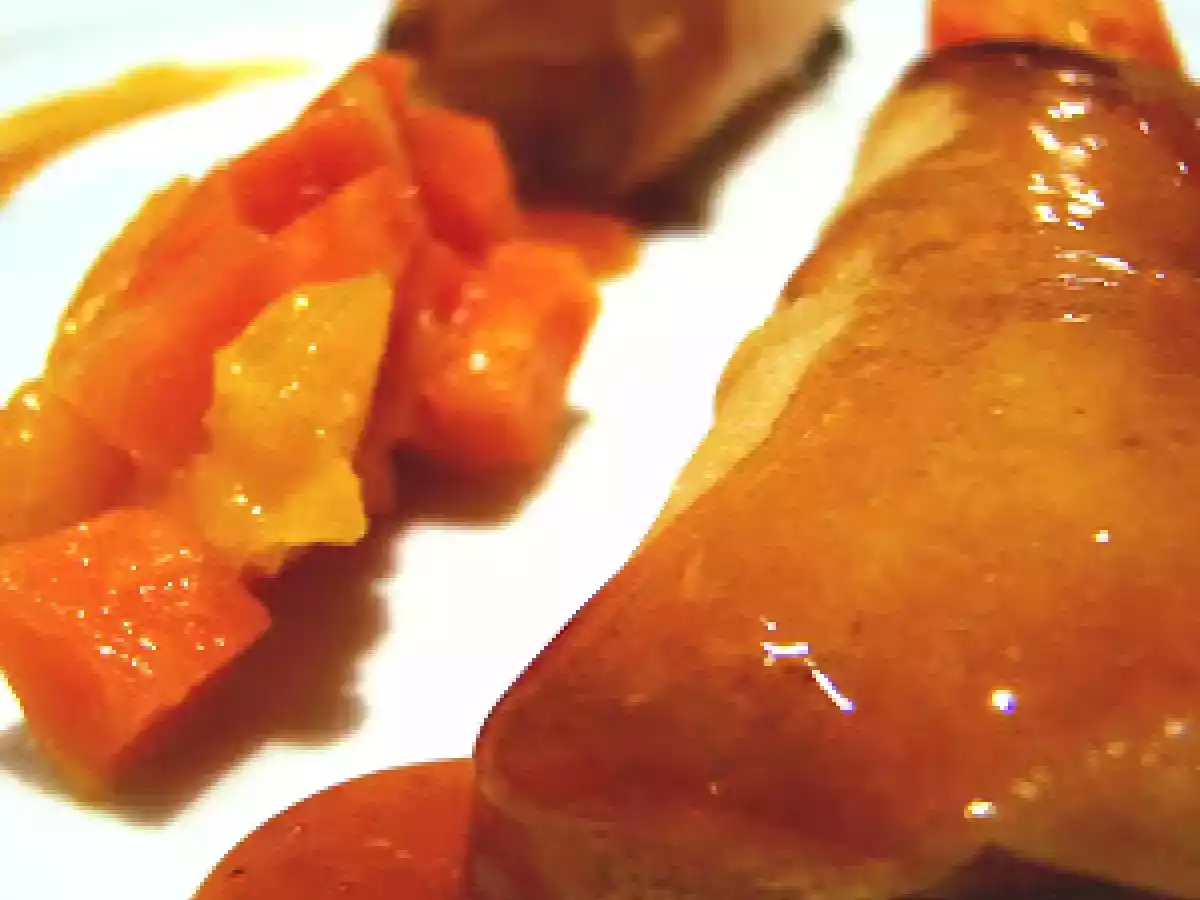 Croustillant carottes-abricots et caramel d'epices votez maintenant PrécédentSuivant Entréefacile25 min Envoyer cette recette à un ami Imprimer cette page Poser une question à l'auteur Publier votre photo de cette recette Ingrédients 4 Croustillants de carottes et abricots 1,5 dl de jus d'orange feuilles de brick 8 abricots secs 400 g de carottes taillées en des ½ oignon 2 cuillères a soupe de sucre glace, 1 noix de beurre fondu huile d'olive sel et poivre Le caramel : le jus d'une orange 1 pointe de curry 1 pointe de gingembre frais râpé quelques graines de cardamome 1 trait de vinaigre balsamique blanc 80 g de sucre