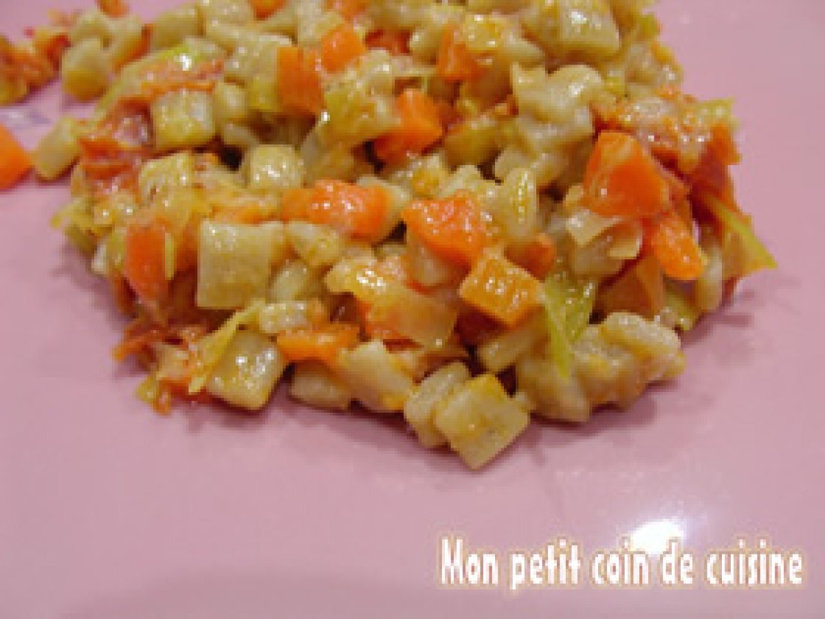 Crozets aux carottes et poireaux Entréefacile50 min479 Kcal Envoyer cette recette à un ami Imprimer cette page Poser une question à l'auteur Publier votre photo de cette recette Ingrédients 4 200 g de crozets 2 beaux poireaux 2 belles carottes bouillon de volaille 3 cuillères à soupe d'huile d'olive 150 g de chorizo coupé en très fines tranches Sel poivre du moulin Coût estimé: 2.91Euros€ (0.73€/part)