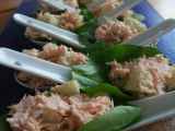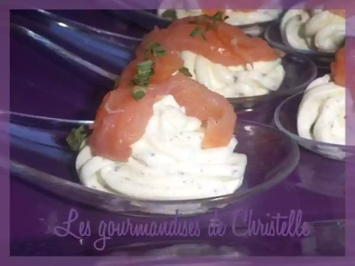 Cuillères apéritives à la mousse de fromage ail et fines herbes et au saumon Entréefacile17 min57 Kcal Envoyer cette recette à un ami Imprimer cette page Poser une question à l'auteur Publier votre photo de cette recette Ingrédients 10 1 fromage ail et fines herbes 2 tranche de saumon fumé 2 cuillère à soupe de crème fraîche liquide poivre ciboulette Coût estimé: 5Euros€ (0.5€/part)