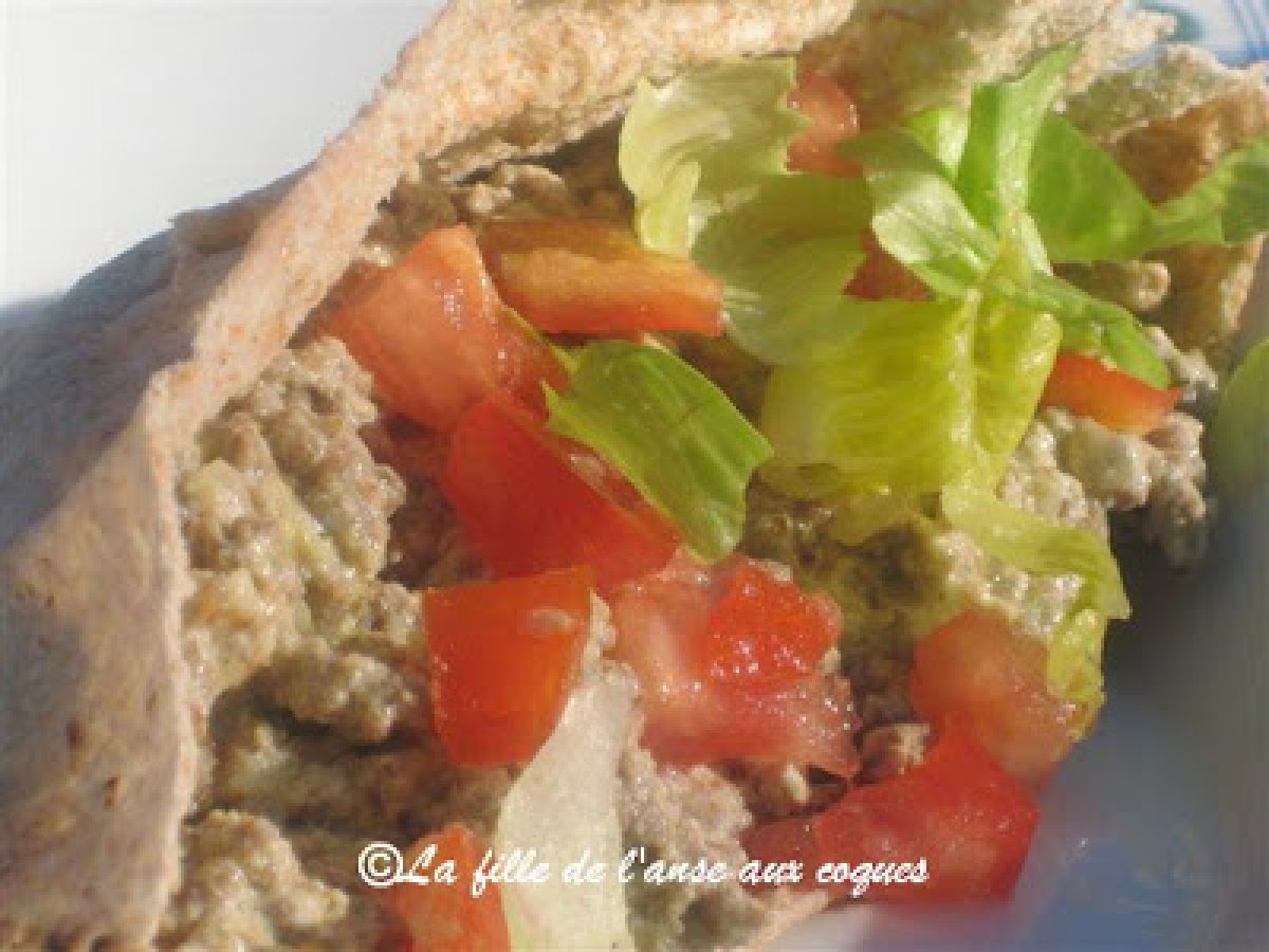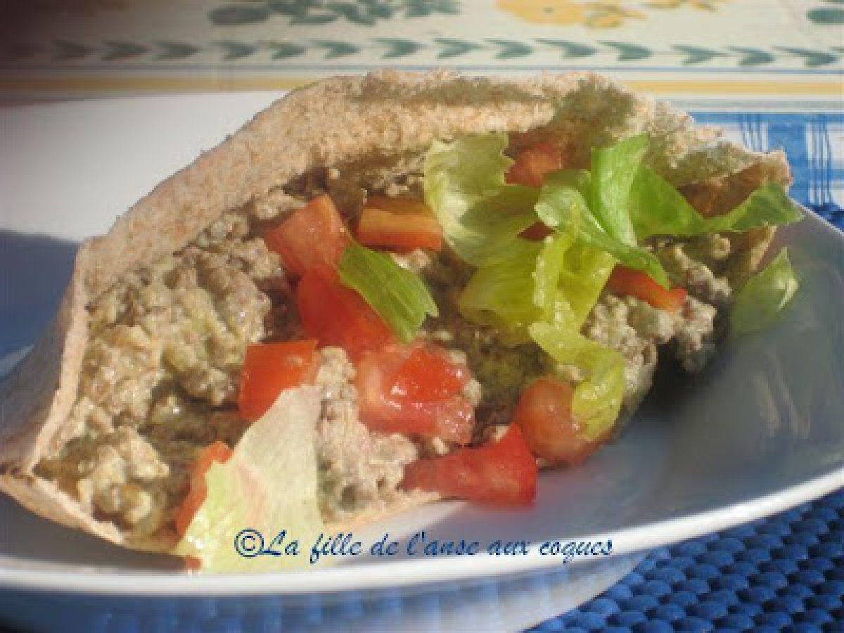 Curry de boeuf en pita PrécédentSuivant Entréefacile30 min Envoyer cette recette à un ami Imprimer cette page Poser une question à l'auteur Publier votre photo de cette recette Ingrédients 6 500 g (1 lb) de boeuf haché 1 oignon moyen, haché 1 gousse d'ail 7 ml (1 ½ cuillère à thé de sel 2 ml (½ cuillère à thé de gingembre moulu) 2 ml (½ cuillère à thé) de poudre de curry 1 oeuf 250 ml (1 tasse) de yogourt (yogourt nature, ou de la crème sure) 6 pains individuels « pita » Laitue déchiquetée (mis de la romaine) 3 tomates hachées Ajouts : poivre Un peu d'huile d'olive pour la cuisson de la viande. Olives noires hachées au dernier moment des lanières de poivrons des oignons verts pour napper, un peu de yogourt ou de crème sure.