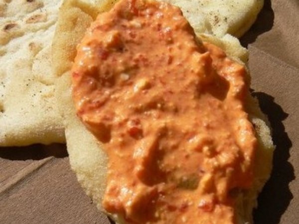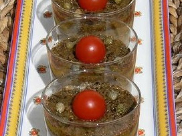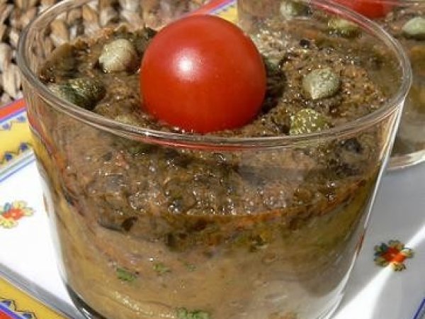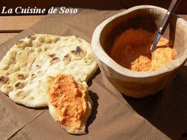 Dip aux poivrons rouges-féta et galettes de semoule , verrines aubergines-tapenade.