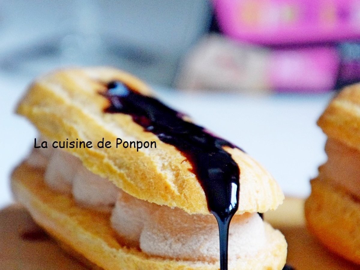 Je vous propose un éclair trompe l'oeil, réalisé avec un éclair tout prêt de pretagarnir*! En effet, la crème semble être une chantilly sucrée et la crème noire du chocolat, alors qu'il s'agit d'une mousse de foie gras et d'une crème balsamique réduite! Ces éclairs peuvent être préparés des heures à l'avance et c'est toujours un point très positif quand on reçoit du monde...
