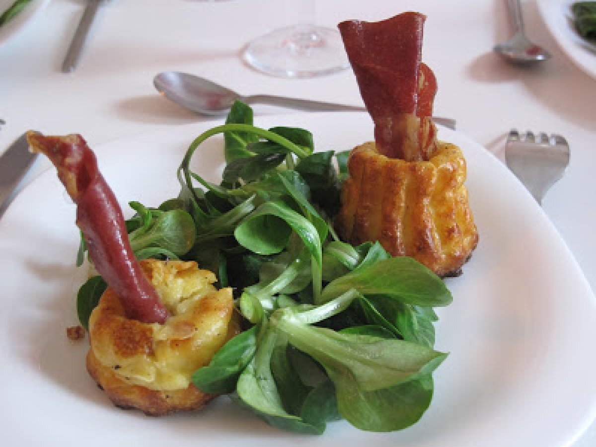 Cannelés au crottin de chèvre-ciboulette et trompettes de coppa