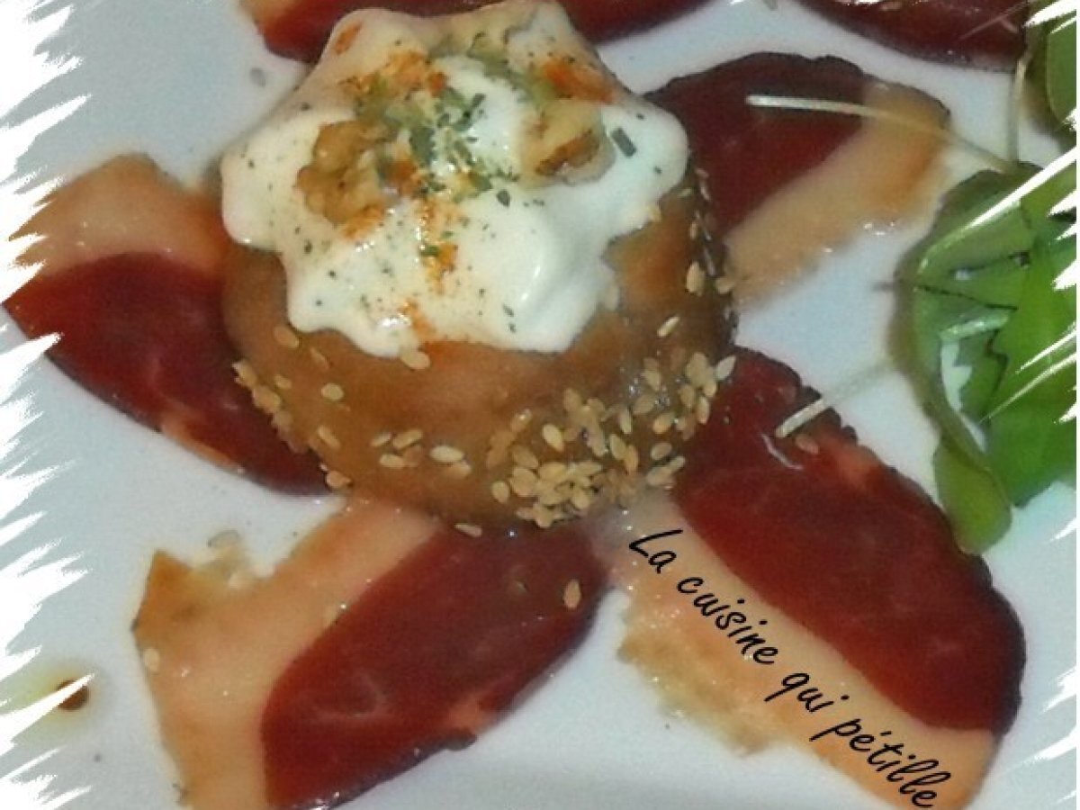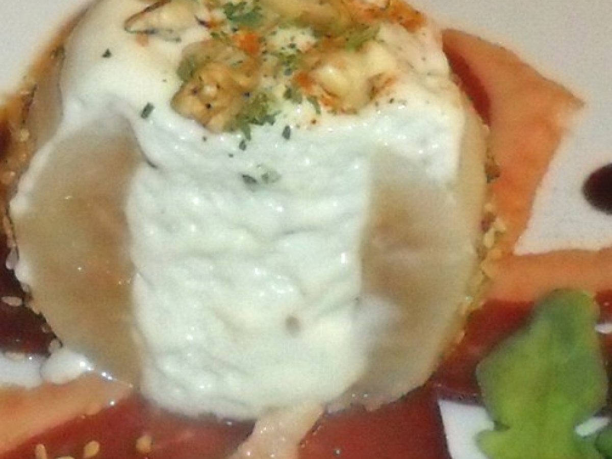 Une entrée originale revisitée, parfaite pour l'été: une poire à l'espuma de roquefort sous une rosace de magret de canard! blog: cuisine-qui-petille.overblog.com
