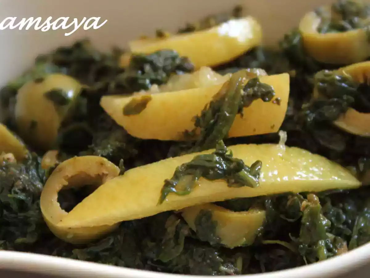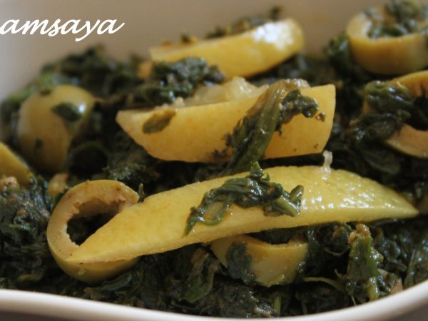 Epinards aux olives et citron confit Entréemoyen45 min158 Kcal Envoyer cette recette à un ami Imprimer cette page Poser une question à l'auteur Publier votre photo de cette recette Ingrédients 4 1 kg d'épinards frais 6 gousses d'ail 1 petit bouquet de coriandre 1 cc de paprika 1/2 cc de sel 1/2 cc de poivre 1/2 cc de cumin 1/4 citron confit 100 g d'olives mauves ou vertes Coût estimé: 4.52Euros€ (1.13€/part)