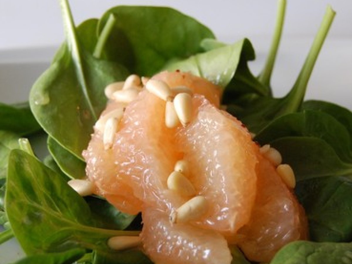 Épinards et pamplemousses, vinaigrette au vinaigre de framboise
