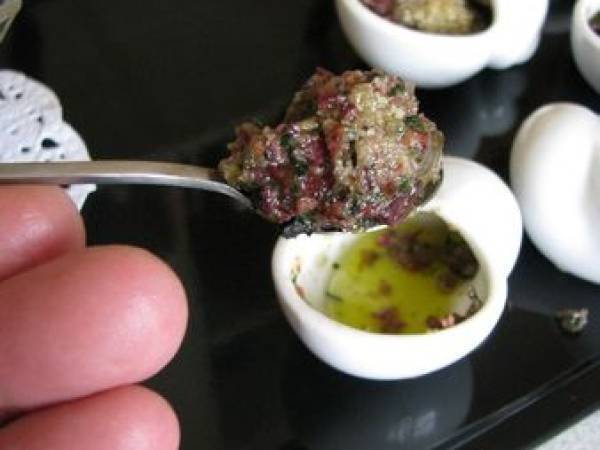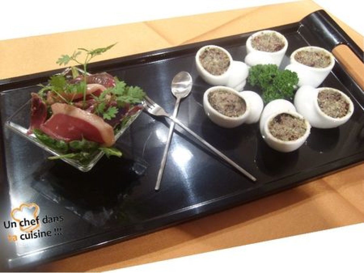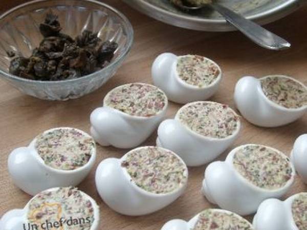 Escargots farcis à la gascogne votez maintenant PrécédentSuivant Entréefacile25 min Envoyer cette recette à un ami Imprimer cette page Poser une question à l'auteur Publier votre photo de cette recette Ingrédients 2 2 dz d'escargots de Bourgogne (gros) 125 g de beurre 50 g de magret de canard séché 50 g de gésiers confits 1 petite échalote chapelure QS 100 g de roquette vinaigrette QS 1 petite botte de cerfeuil ou de persil
