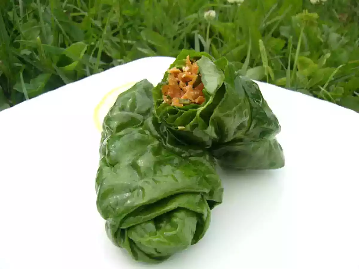 Feuilles de bette à carde farcies Entréefacile13 min99 Kcal Envoyer cette recette à un ami Imprimer cette page Poser une question à l'auteur Publier votre photo de cette recette Ingrédients 6 6 grandes feuilles de bette à carde farce: 1 1/2 tasse ( 375 ml) de carottes râpées 2 cuillerées à table (30 ml) de graines de tournesol moulues (au moulin à café) 3 cuillerées à table (45 ml) de raisins secs 1/4 de tasse (60 ml) de menthe hachée 1/4 de tasse (60 ml) de persil haché 2 cuillerées à thé (10 ml) de jus de citron 1 cuillerée à thé de miso blanc (optionnel, on peut remplacer par une pincée de sel) une pincée de cannelle et de cumin (optionnel) vinaigrette: 2 cuillerées à table de jus de citron 1 cuillerée à table d'huile d'olive Coût estimé: 2.23Euros€ (0.37€/part)