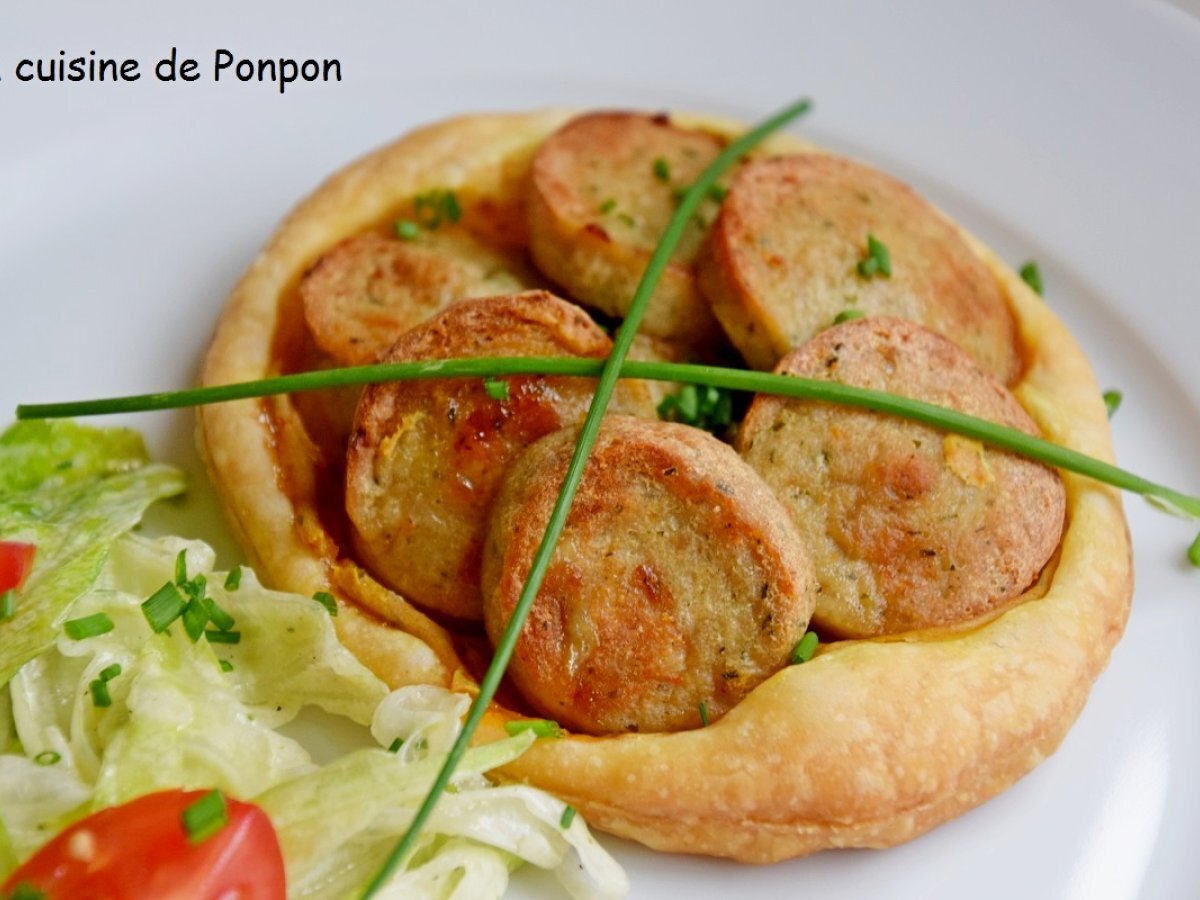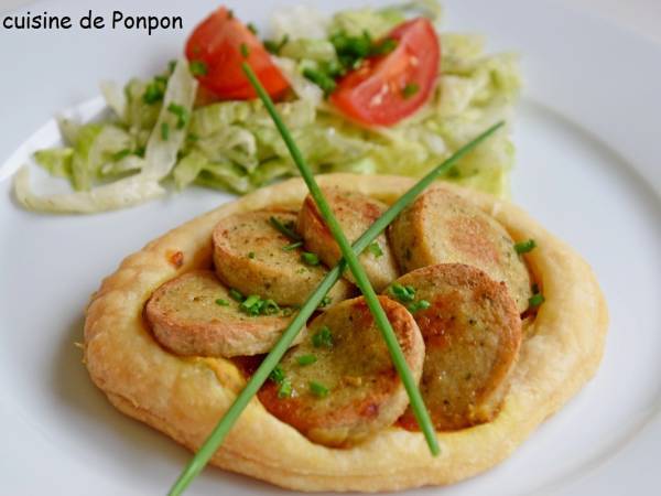 Feuilleté de boudin blanc sur un lit de confit de poivrons et moutarde à l'ail des ours