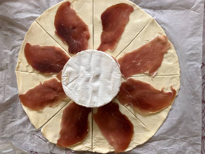 Déposer une tranche de jambon cru sur le demi camembert, ainsi que des oignons, précédemment émincés et cuits.