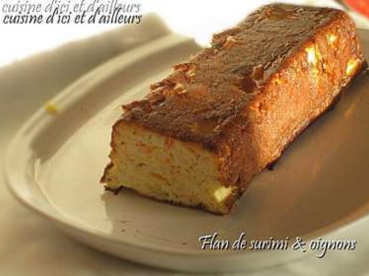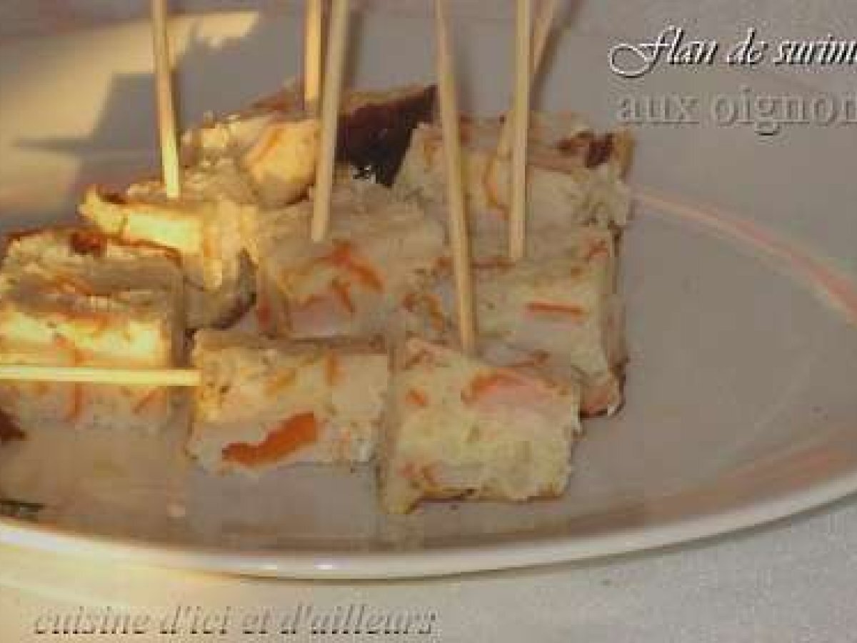 Flan au surimi & oignons PrécédentSuivant Entréefacile25 min100 Kcal Envoyer cette recette à un ami Imprimer cette page Poser une question à l'auteur Publier votre photo de cette recette Ingrédients 6 1/2 oignon 1 pincée de sel poivre 4 ufs 5 CS de fromage blanc 0% 1 CS aneth surgelés pour moi 200 gr de surimi coupé très finement Coût estimé: 3.27Euros€ (0.54€/part)