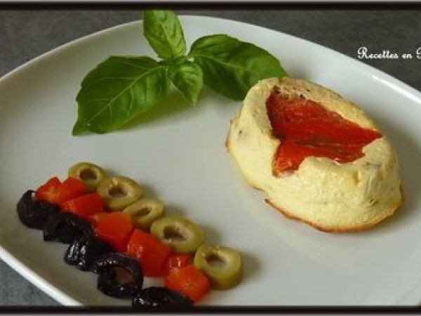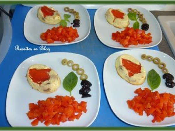 Flans de ricotta aux olives et aux poivrons votez maintenant PrécédentSuivant Entréefacile55 min Envoyer cette recette à un ami Imprimer cette page Poser une question à l'auteur Publier votre photo de cette recette Ingrédients 6 1 poivron rouge 250 g de ricotta 1 oeuf 15 g d'olives vertes 15 g d'olives noires 5 feuilles de basilic 1 cuillère à moka de zestes de citron râpé sel, poivre Pour le décoration : quelques rondelles d'olives noires 6 feuilles de basilic