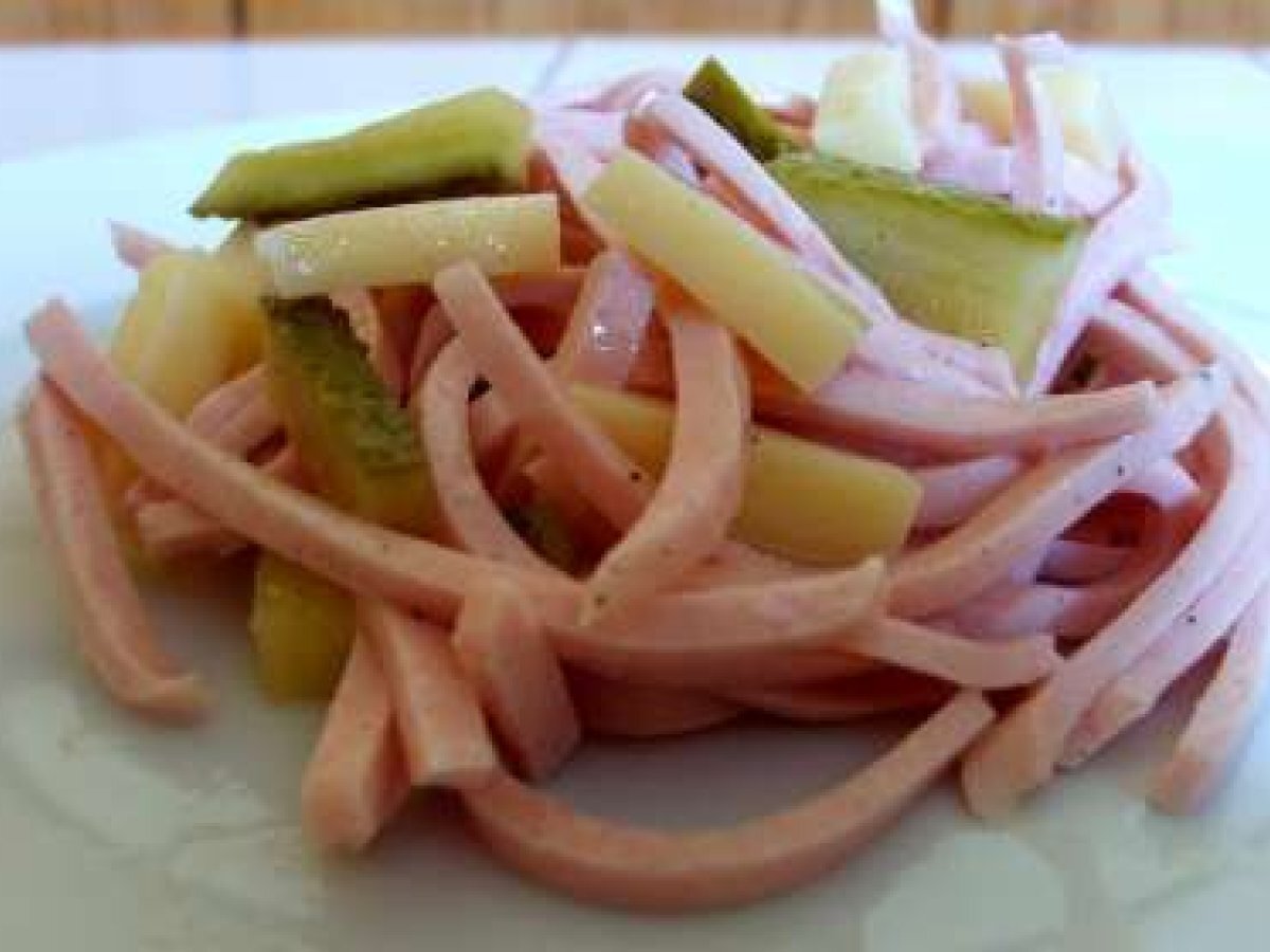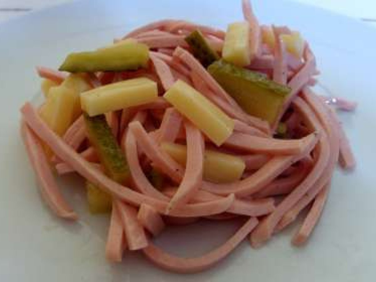 Fleischsalat / salade de viande votez maintenant PrécédentSuivant Entréemoyen10 min Envoyer cette recette à un ami Imprimer cette page Poser une question à l'auteur Publier votre photo de cette recette Ingrédients 4 300 g de Fleischsalat (cervelas) 6 petites tranches d'emmental 2 gros cornichons 5 cuillères à soupe d'huile 3 cuillères à soupe de vinaigre 1 cuillère à soupe d'eau Poivre