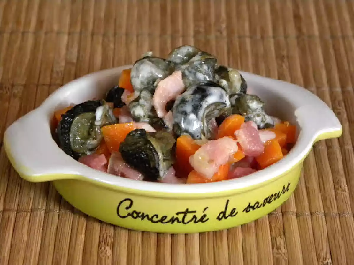 Fricassée d'escargots à la crème de camembert votez maintenant Entréefacile35 min Envoyer cette recette à un ami Imprimer cette page Poser une question à l'auteur Publier votre photo de cette recette Ingrédients 3 2 douzaines d'escargots 50 cl de bouillon de légumes 1 carotte 80 g de lardons natures 1 petit morceau de beurre 1 échalote pelée et émincée 1/8 de camembert sans la croûte 10 cl de crème liquide