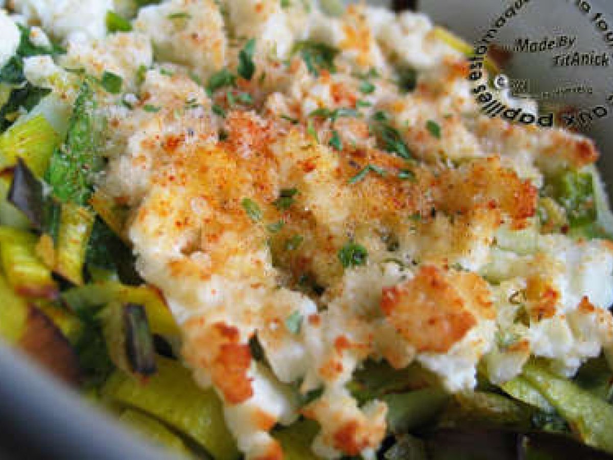 Gratin de poireaux, vert d'ail, céleri et chou rave à la fêta Entréefacile40 min Envoyer cette recette à un ami Imprimer cette page Poser une question à l'auteur Publier votre photo de cette recette Ingrédients 4 2 choux raves 2 poireaux 20 feuilles de céleri Le vert d'une tête d'ail frais 150 g de fêta 4 c. à thé de chapelure Persil Huile d'olive Paprika Sel et poivre