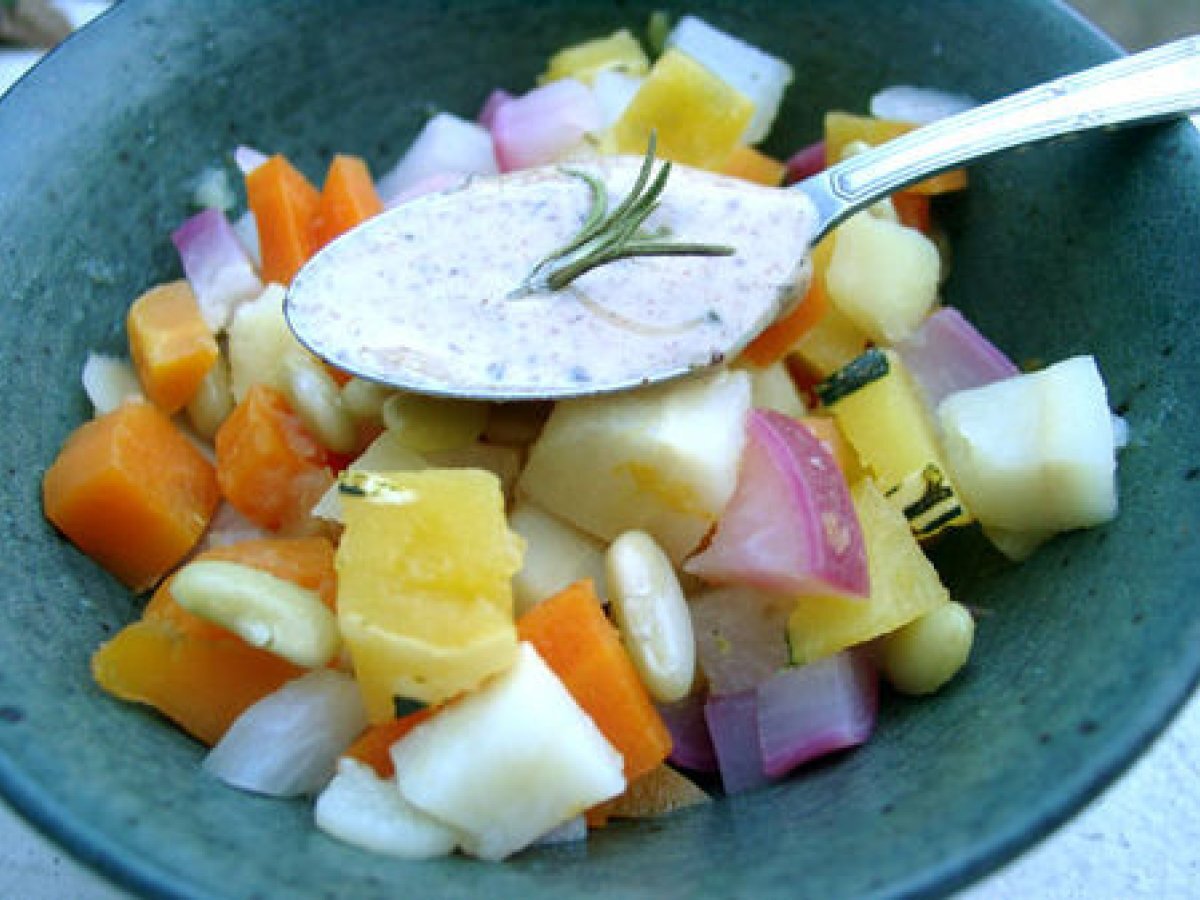 Une jardinière aux couleurs de l'automne, parfumée au romarin et servie avec une petite sauce à l'amande.