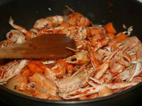 - Faire revenir dans un peu d'huile d'olive très chaude les têtes et les coffres des langoustines. Faire sauter à feu vif quelques minutes.