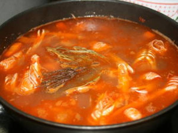 Déglacer avec l'alcool, laisser réduire. Ajouter le vin blanc. Faire réduire.- Mouiller avec le fumet de poisson, ajouter le bouquet garni, l'ail, le safran. Saler. Cuire à petit frémissement et à découvert.