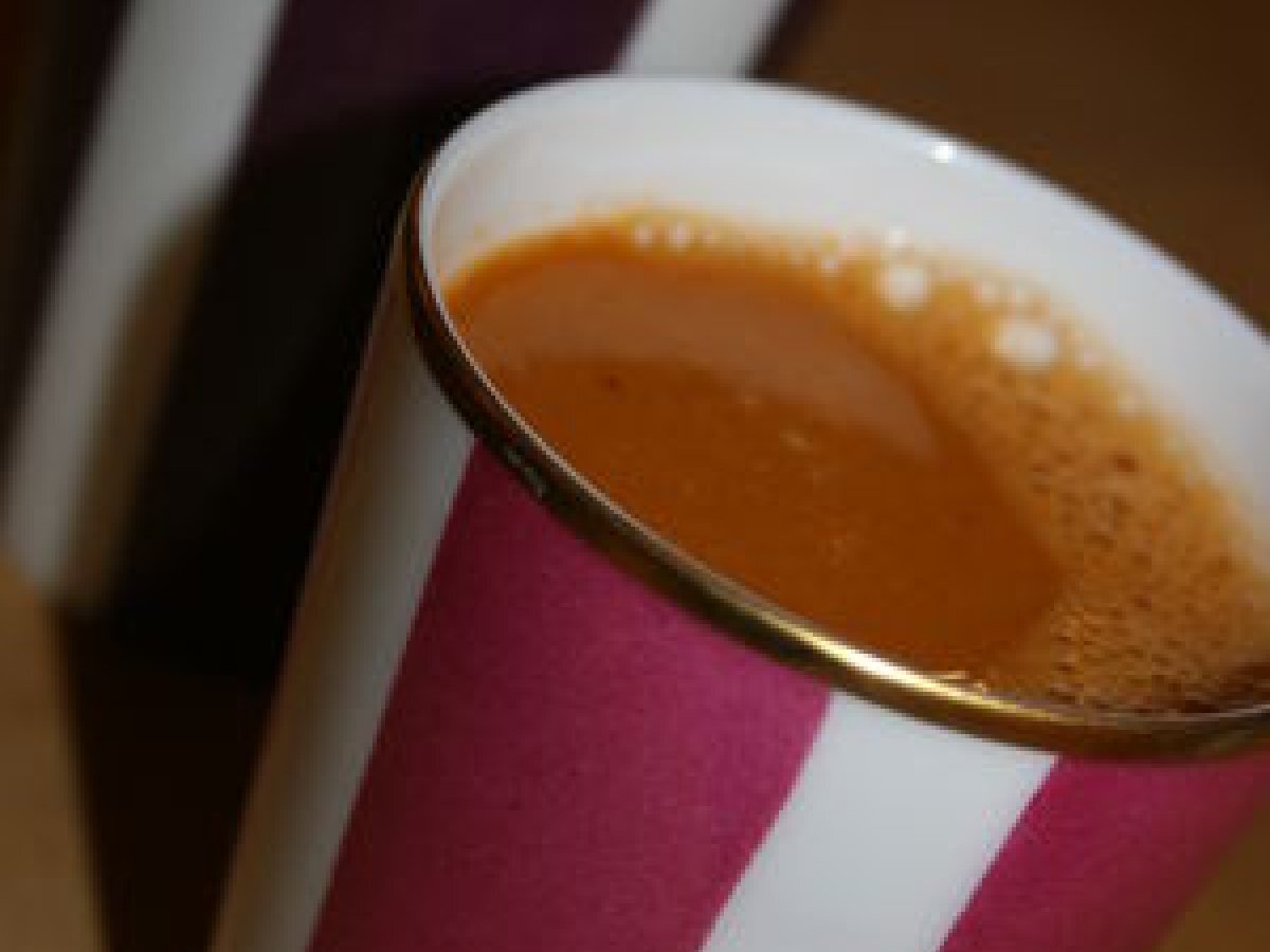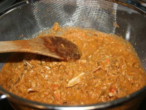 Passer grossièrement au mixer. Chinoiser en pressant pour écouler le jus.- Pour lier, ajouter 100 grammes de riz rond cuit et mixer. Passer éventuellement au chinois pour filtrer les morceaux de riz qui n'auraient pas été bien mixés.