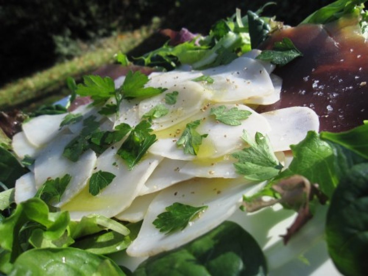 Lamelles tièdes de topinambours en salade, huile d'olive et thon fumé