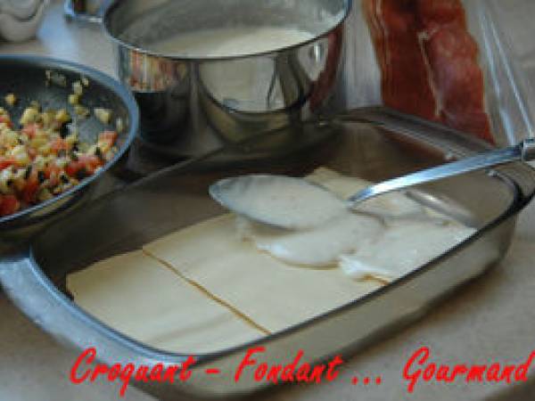 Lasagnes au jambon cru PrécédentSuivant Entréefacile1 h 5 m430 Kcal Envoyer cette recette à un ami Imprimer cette page Poser une question à l'auteur Publier votre photo de cette recette Ingrédients 6 12 feuilles de lasagnes pré-cuites 4 belles tranches de jambon de Bayonne 3 courgettes 1 oignon 4 tomates 60 g de beurre 75 g de farine 1 litre de lait ½ cuillère à café d'origan sel au basilic et aux baies roses Histoire de goût 100 g de parmesan râpé huile d'olive sel poivre du moulin Coût estimé: 11.04Euros€ (1.84€/part)