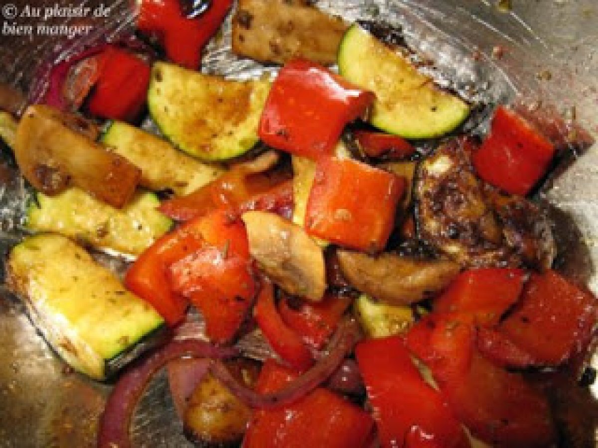 Légumes grillés au vinaigre balsamique Entréefacile24 min Envoyer cette recette à un ami Imprimer cette page Poser une question à l'auteur Publier votre photo de cette recette Ingrédients 4 1 gros poivron rouge en lanières de 2.5 cm de large 1 courgette moyenne en rondelles de 1 cm 1 oignon rouge moyen en rondelles de 1 cm 4 gros chapeaux de champignon en lamelles de 1.5 cm 2 cuillères à soupe d'huile d'olive extravierge 1 cuillère à thé d'origan séché émietté 1 cuillère à soupe de vinaigre balsamique 1/4 cuillère à thé de sel 1/4 cuillère à thé de poivre