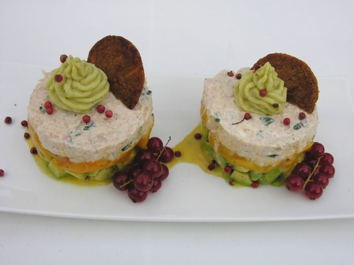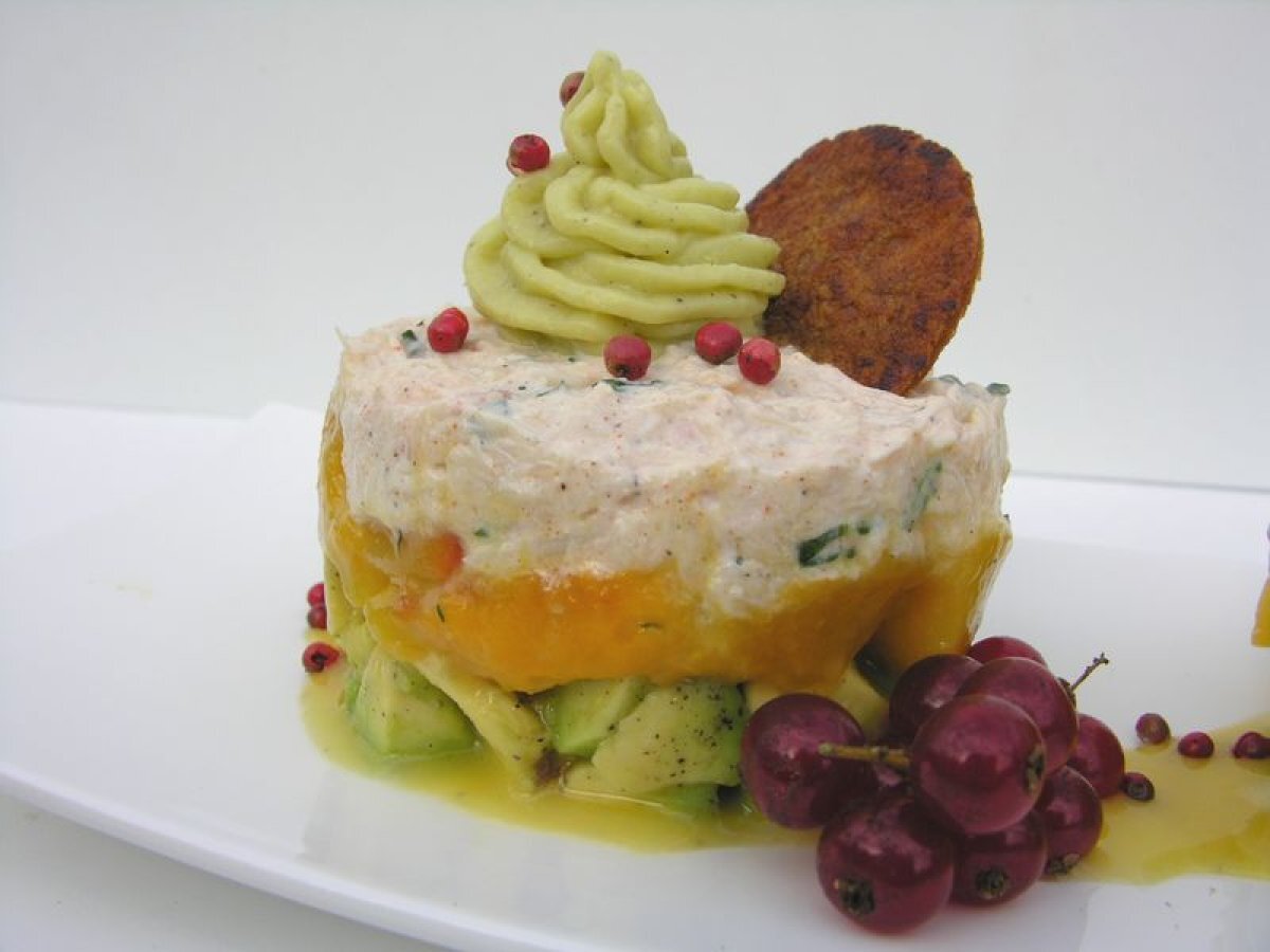 Mille-feuilles de crabe à la pêche parfumée au thym et à l'avocat au vinaigre