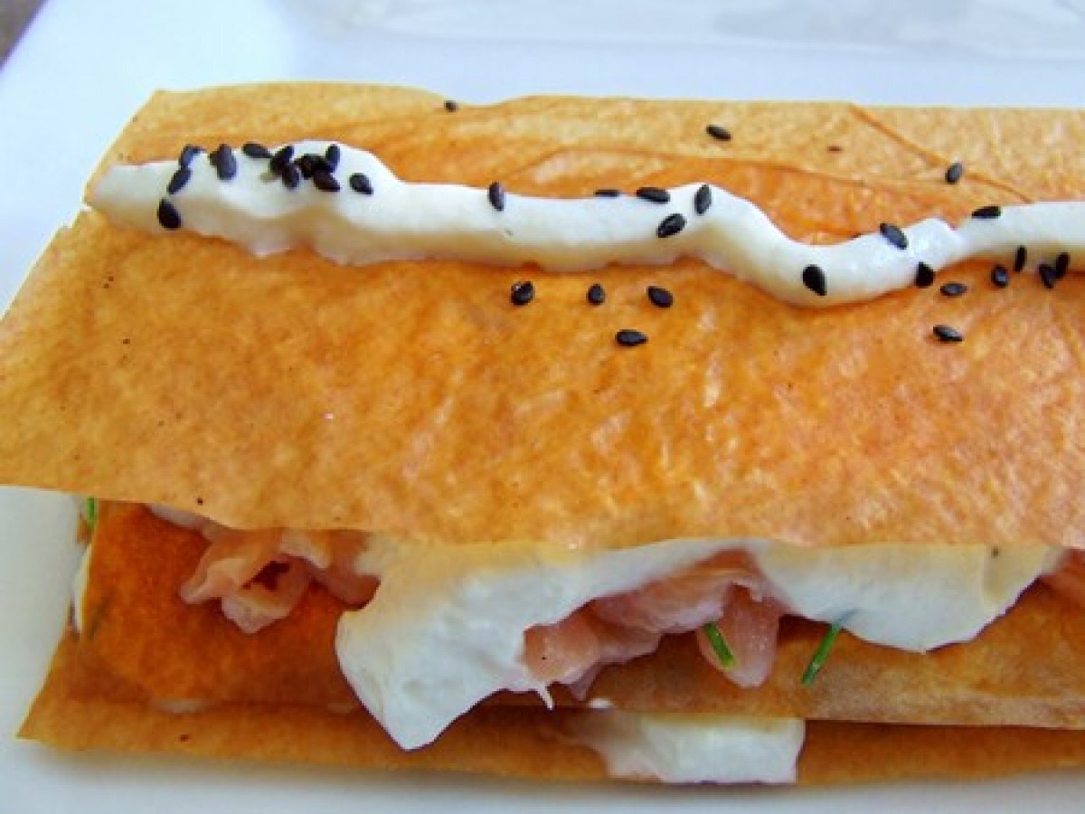 Millefeuille saumon, endive & concombre, espuma d'asperge