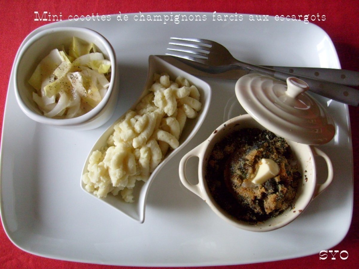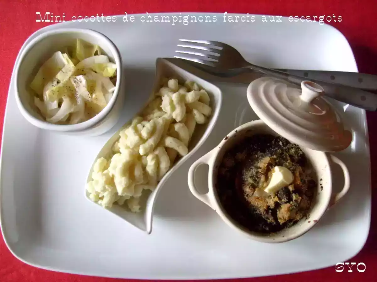 Mini cocottes de champignons farcis aux escargots, de mamigoz Entréemoyen35 min Envoyer cette recette à un ami Imprimer cette page Poser une question à l'auteur Publier votre photo de cette recette Ingrédients 4 4 gros champignons de Paris à farcir + 8 champignons moyens ½ boite descargots au naturel Une botte de persil 1 belle échalote 2 ou 3 grosses gousses dail (suivant votre goût) 50 gr de beurre demi-sel 2 cuillères à soupe dhuile dolive Gros sel, sel fin et poivre. De la chapelure pour la finition. Accompagnement Purée de pommes de terre et salade verte, ou endives suivant la saison.