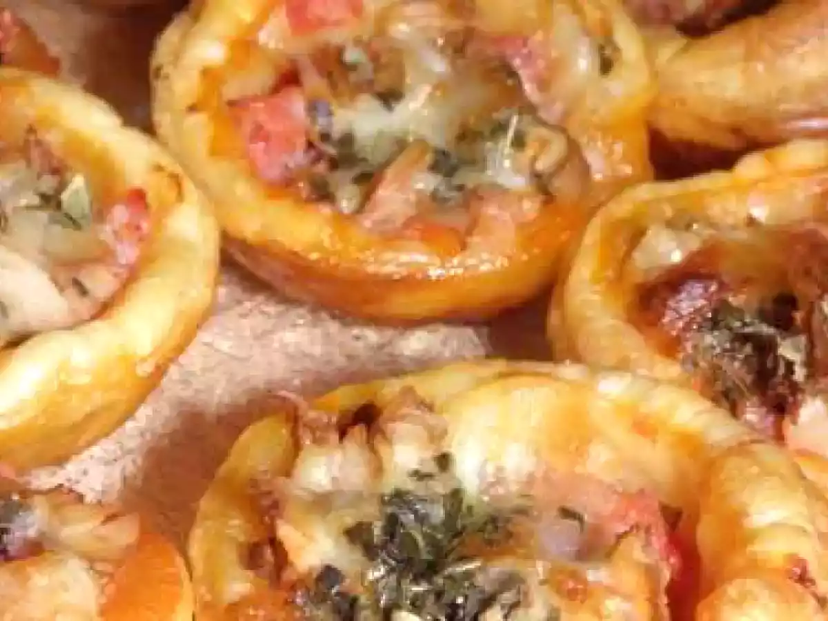 Ces mini-pizzas sont réalisées avec une pâte feuilletée découpée en cercles, garnie d'un coulis de tomates, de jambon et de champignons mixés, puis recouverte de dés de mozzarella et d'origan. Elles sont cuites au four pendant 20 minutes à 180°C pour une texture croustillante et fondante. À déguster chaudes, ces bouchées offrent un équilibre parfait entre la douceur du jambon, la saveur terreuse des champignons et la fondance de la mozzarella.