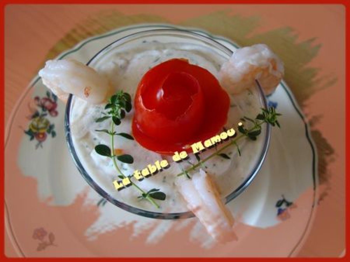 Mousse au crabe Entréefacile20 min202 Kcal Envoyer cette recette à un ami Imprimer cette page Poser une question à l'auteur Publier votre photo de cette recette Ingrédients 6 3 feuilles de gélatine 10 cl d'eau 1 boite de crabe 100 g de crevettes 100 g de surimi aneth 1 échalote 1 cuillère à café de raifort 20 cl de crème liquide Décoration : 3 tomates cocktail 6 branches de thym citron 9 gambas