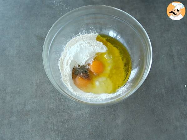 Mélanger les oeufs, la farine, la levure, l'huile d'olive le sel et le poivre.