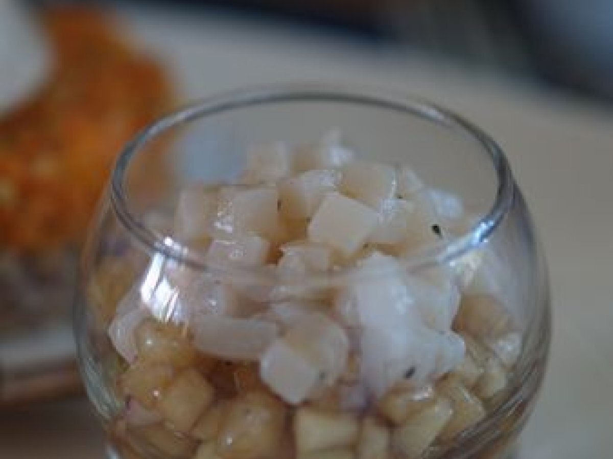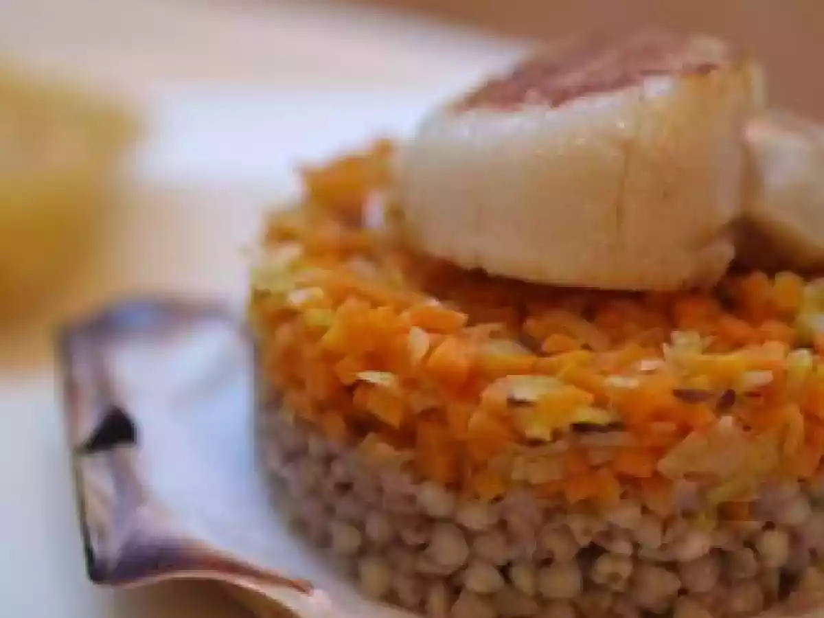 Noix de saint-jacques sur lit de sarrasin et tartare de saint-jacques et de poire-melon votez maintenant PrécédentSuivant Entréefacile30 min Envoyer cette recette à un ami Imprimer cette page Poser une question à l'auteur Publier votre photo de cette recette Ingrédients 6 1) Tartare de Saint-Jacques et de poire-melon : 5 à 6 noix de Saint-Jacques fraîches 1 ou 2 poire-melon(s) 1/4 de pomme 10 g d'oignon rouge pelé 2 cuillères à soupe d'huile d'olive 1 cuillère à soupe de vinaigre balsamique fleur de sel et du 5 baies 2) Noix de Saint-Jacques sur lit de sarrasin : Noix de Saint-Jacques sur lit de sarrasin 3 ou 6 noix de Saint-Jacques avec leur corail 1 beau poireau 1 ou 2 carottes selon leur taille du beurre 1 cuillère à café de graines de carvi 100 g de sarrasin sel et poivre du beurre ou du Mycryo