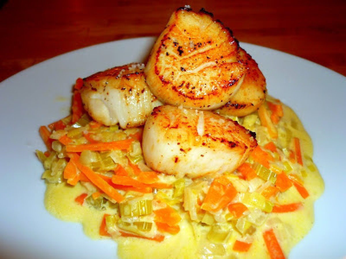 Noix de st-jacques et petits légumes au cidre Entréefacile22 min484 Kcal Envoyer cette recette à un ami Imprimer cette page Poser une question à l'auteur Publier votre photo de cette recette Ingrédients 4 16 noix de St-Jacques (à voir bien sûr suivant la grosseur) 4-5 carottes 2 blancs de poireaux 2 oignons 2 ou 3 branches de céleri 40 cl de cidre brut 30 cl de crème liquide 2 cuillères à soupe d'huile d'olive sel fleur de sel poivre blanc beurre Coût estimé: 17.12Euros€ (4.28€/part)