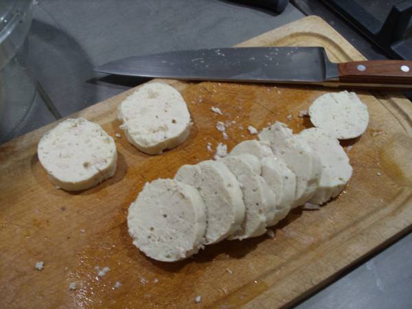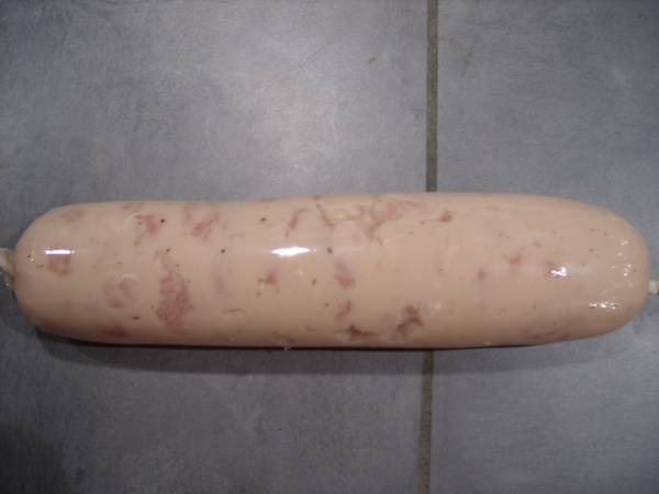 Faire cuire les boudins dans une casserole d'eau frémissante pendant 25 minutes. Egoutter le rouleau de farce puis laisser refroidir quelques instants. Ôter le film qui le recouvre, puis le couper en tranches. Réserver au frais.
