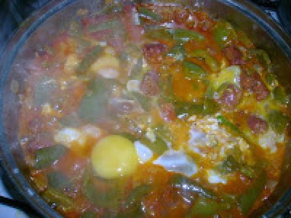 Ojja tunisienne aux merguez Entréefacile30 min Envoyer cette recette à un ami Imprimer cette page Poser une question à l'auteur Publier votre photo de cette recette Ingrédients 4 250 g de poivrons vert 250 g de tomates mûres 250 g de merguez 1 petit oignon 4 oeufs 4 gousses d'ail 1 cuillère à café de hrissa 1 cuillère à café de concentré de tomate un peu de carvi sel poivre paprika huile d'olive