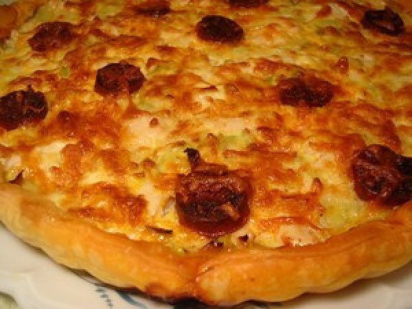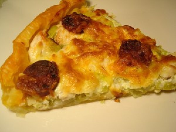 P'tite tarte poireaux/poulet/chorizo PrécédentSuivant Entréefacile42 min961 Kcal Envoyer cette recette à un ami Imprimer cette page Poser une question à l'auteur Publier votre photo de cette recette C'est sympa et encore milles fois meilleure ! Ingrédients 4 1 rouleau de pâte feuilletée 3 blancs de poireaux 2 filets de poulet 3 oeufs Chorizo Mozzarella râpée 15 cl de crème fraîche liquide à 3 % de matière grasse Sel poivre Huile d'olive Noix de muscade Coût estimé: 8.86Euros€ (2.21€/part)