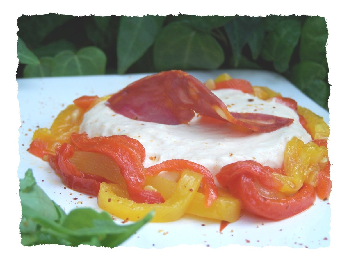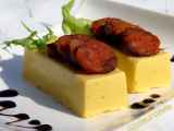 Panna cotta au chorizo et piment d'espellette, poivrons marinés. Entréemoyen1 heure Envoyer cette recette à un ami Imprimer cette page Poser une question à l'auteur Publier votre photo de cette recette Ingrédients 4 ?10 rondelles de chorizo ?1 c à café rase de piment d'Espelette + 4 pincées pour le décor ?2 beaux poivrons rouges ?1 poivron jaune ?3 feuilles de gélatine ?50cl de crème liquide ?2 c à soupe d'huile d'olive ?fleur de sel