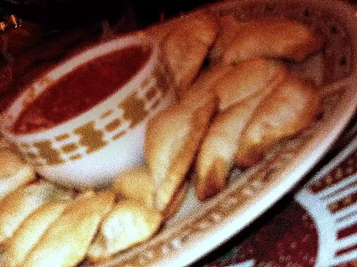 De petites rissoles au poisson faciles à préparer, que l'on sert sur un grand plateau autour d'un bol de coulis de tomates bien relevé.