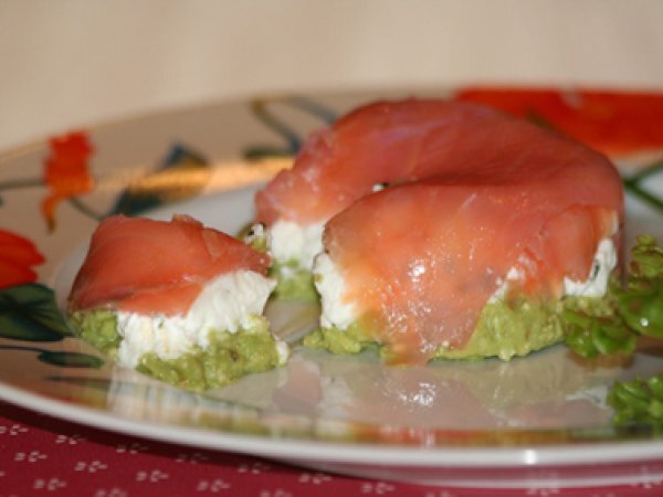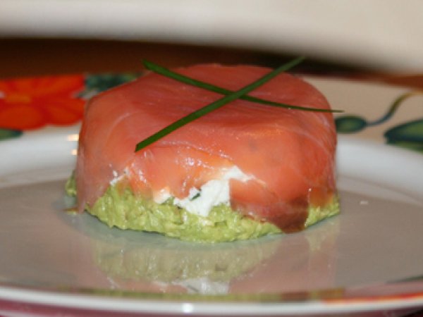 Petite timbale de saumon fumé et chèvre frais en robe verte PrécédentSuivant Entréefacile15 min Envoyer cette recette à un ami Imprimer cette page Poser une question à l'auteur Publier votre photo de cette recette Ingrédients 4 4 tranches de saumon fumé 2 avocats mûrs 1 chèvre frais 1 peu de ciboulette 1 peu d’huile d’olive 1 peu de poivre sélim 1 peu d’épices à Guacamole