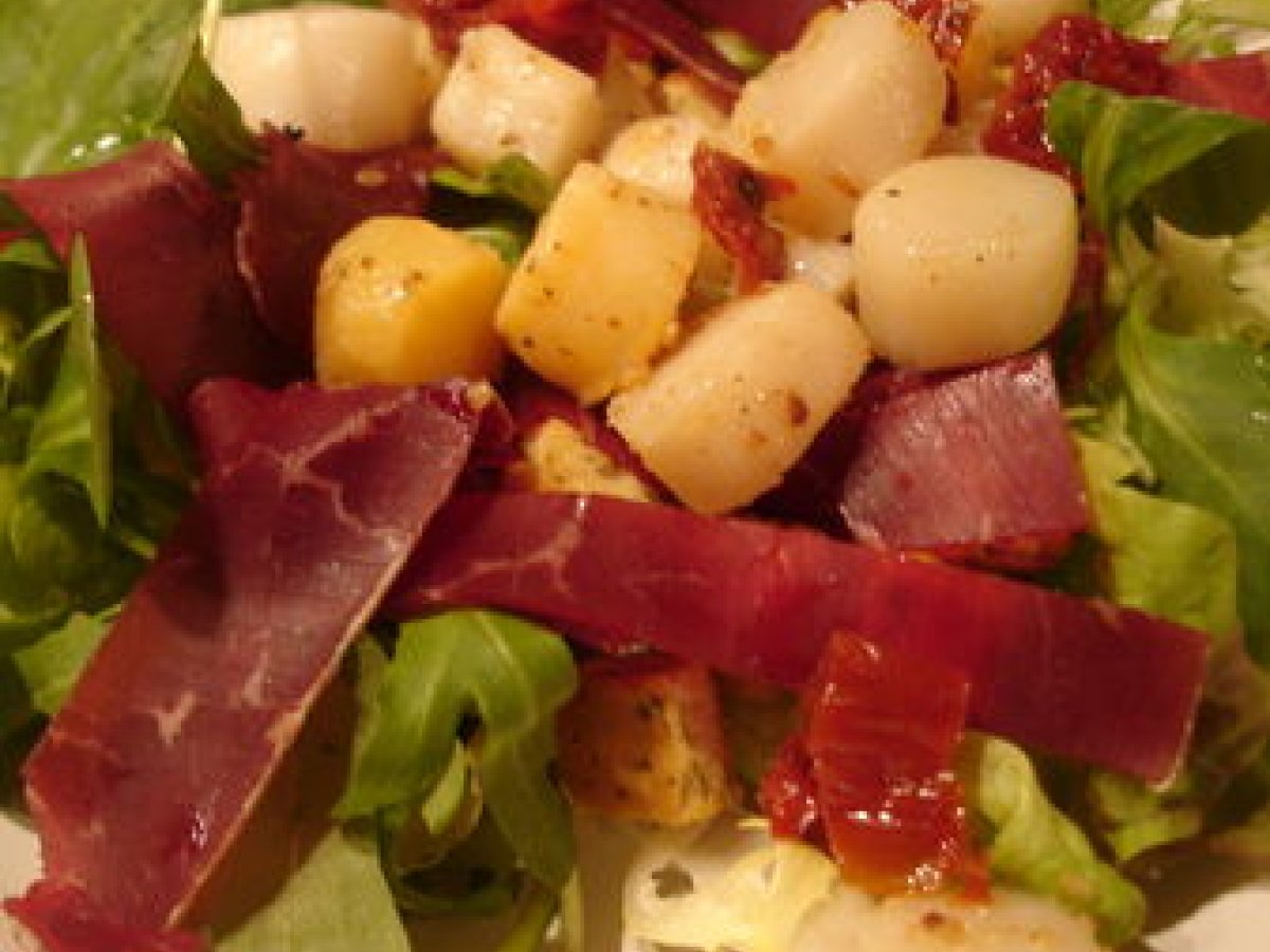 Petites salades entre terre et mer Entréefacile10 min Envoyer cette recette à un ami Imprimer cette page Poser une question à l'auteur Publier votre photo de cette recette Ingrédients 4 200 à 250 gr de noix de pétoncles 5 à 6 tranches de viandes des grisons 4 petits poignées de salade mélangée 4 cuillères à soupe de croûtons à salade 4 tomates séchées à l'huile huile d'olive gomasio vinaigre balsamique