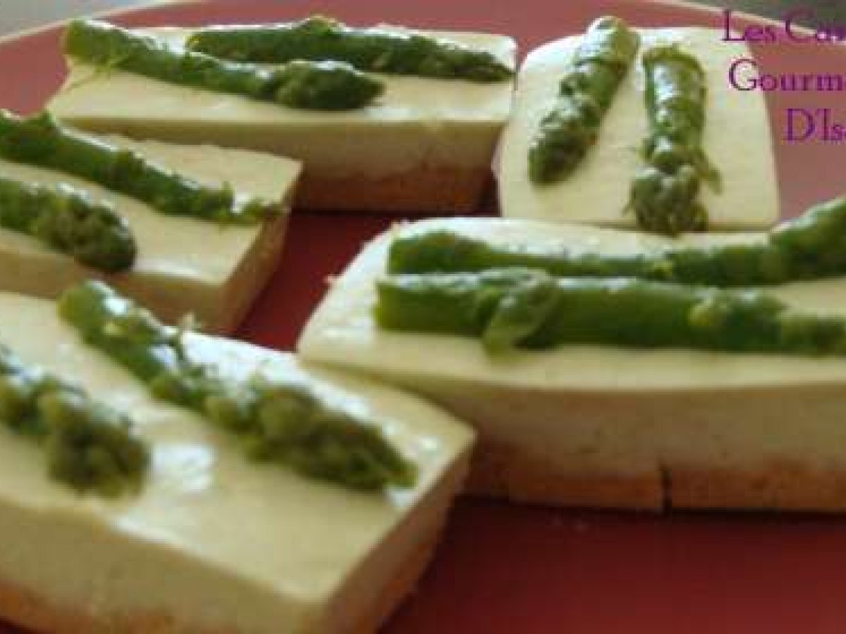 Petits cheesecakes aux asperges vertes PrécédentSuivant Entréefacile15 min Envoyer cette recette à un ami Imprimer cette page Poser une question à l'auteur Publier votre photo de cette recette Ingrédients 8 Pour la base biscuit croquant 100 gr crackers type TUC 70 gr beurre fondu 3 cuillères à soupe graines de sésame 60 gr parmesan Pour la mousse 200 gr d'asperges vertes (M. Picard surgelés ) 160 gr fromage blanc à 20 % 130 gr fromage frais de chèvre (type Billy) 2 cuillères à soupe de zeste d'oranges 1 cuillère à café de Piment d'Espelette 80 gr crème liquide 3 + 1/2 feuilles de gélatine sel poivre
