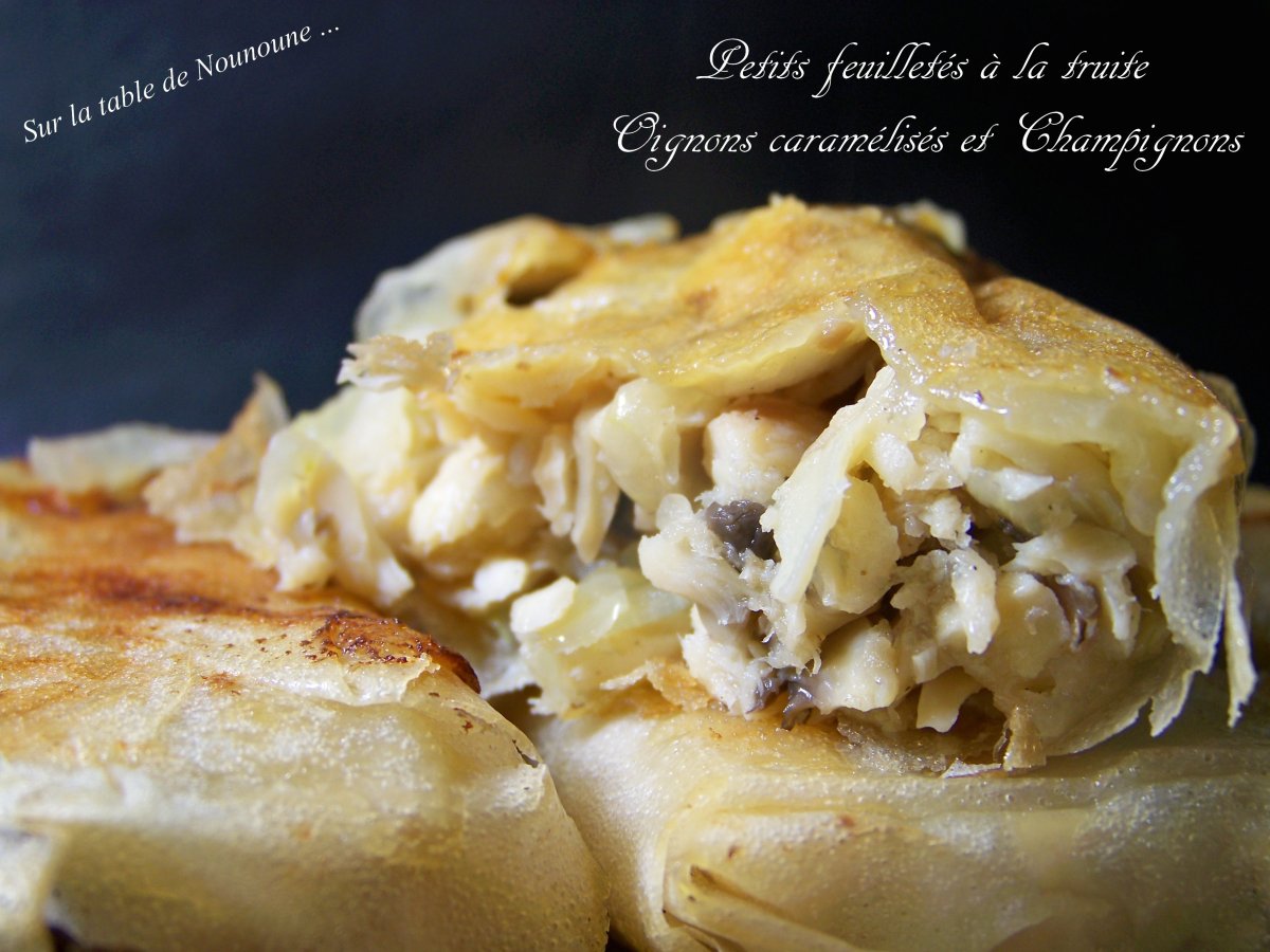 Petits feuilletés à la truite, oignons caramélisés et champignons votez maintenant Entréefacile35 min Envoyer cette recette à un ami Imprimer cette page Poser une question à l'auteur Publier votre photo de cette recette Ingrédients 4 pour 8 petits feuilletés 4 feuilles de brick 2 oignons une 10 aine de champignons blancs de paris 2 boites de filets de truite sans peau sel poivre un peu de beurre fondu