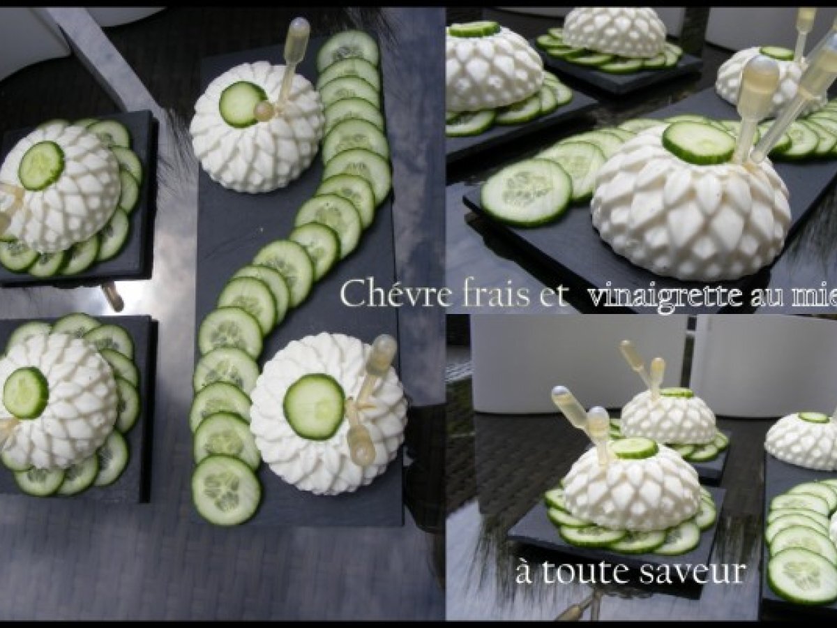 Petits flan au fromage de chèvre et vinaigrette au miel ou aux olives Entréefacile15 min376 Kcal Envoyer cette recette à un ami Imprimer cette page Poser une question à l'auteur Publier votre photo de cette recette Ingrédients 6 400 g de fromage de chèvre frais 20 cl de crème liquide 30 cl de lait 1 sachet d'agar-agar ( 2 g) Poivre 2 cuillerée à café de miel liquide 2 cuillerée à soupe de vinaigre de noix 4 cuillerées à soupe d'huile de noisette 1 mini concombre en tranche fines pour la déco ou quelques graines germées Coût estimé: 7.55Euros€ (1.26€/part)