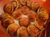 Préchauffez le four à 220°. Etalez la pâte sur le plan de travail. Coupez des petits rons d'environ 6 cm de diamètre. Posez 1 cuillère à soupe de farce au milieu d'un disque de pâte, en prenant soin de laisser libre le bord du disque.