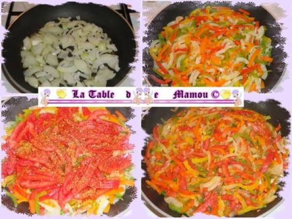 - Ajouter les poivrons, bien mélanger et laisser cuire 5 minutes.Ajouter ensuite les tomates et les épices.